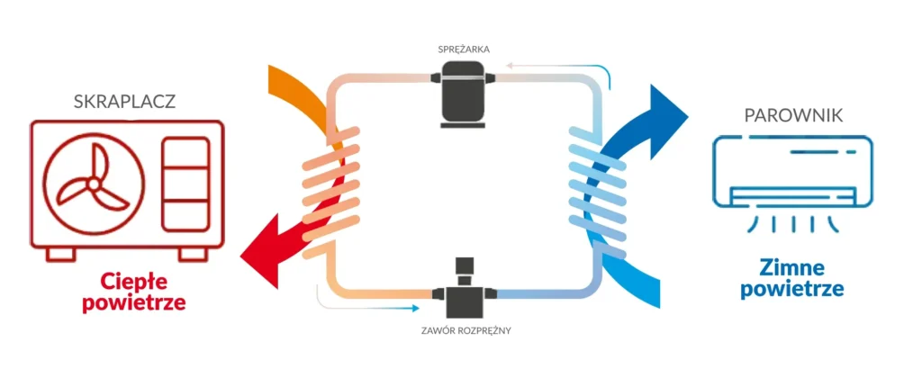 W przypadku klimatyzacji przełączonej na tryb ogrzewania cały mechanizm działa w odwrotną stronę – energia jest pobierana z zewnątrz i przekazywana do wnętrza budynku.